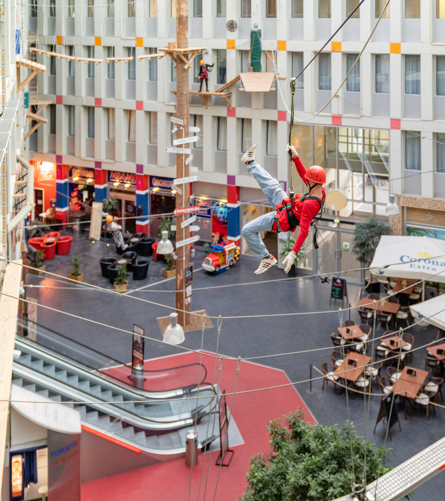 Bewegung, gepaart mit Abenteuer und einer gehörigen Portion Bauchkribbeln in einer einzigartigen Erlebniswelt: Inszeniert in die Räumlichkeiten eines Multiplexkinos und des Shopping Centers Helle Mitte bietet Europas größter Indoor-KletterPark atemberaubende Perspektiven mit beeindruckenden Kletterhöhen, innovativen Streckenverläufen & einem hochmodernen Sicherheitskonzept. Auf diversen Parcours verschiedener Schwierigkeitsgrade kommt vom Kleinkind bis zum versierten Kletterexperten jeder garantiert voll auf seine Kosten. Vorkenntnisse braucht Ihr keine, durchschnittliche Fitness ist absolut ausreichend. Völlige Unabhängigkeit von Witterung, Außentemperatur & Tageslicht machen den Besuch das ganze Jahr über verlässlich planbar.