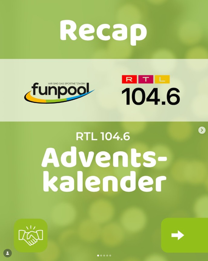 Im Dezember haben wir den Adventskalender von RTL 104.6 mit Sportgutscheinen von 10 unserer Netzwerkpartner gefüllt. Diese wurden dann mit Nennung des jeweiligen Sportcenters on-air verlost, was zum einen für einen Reichweiten-Boost unserer Partner sorgte und zum anderen für glückliche sportbegeisterte Radiohörer:innen!